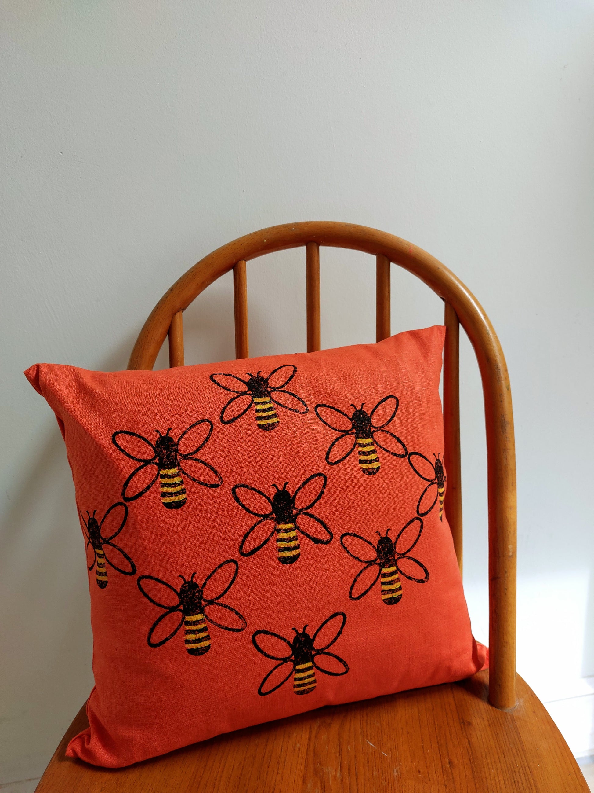 Busy bees on a marmalade linen cushion. Finished with an envelope style closure.