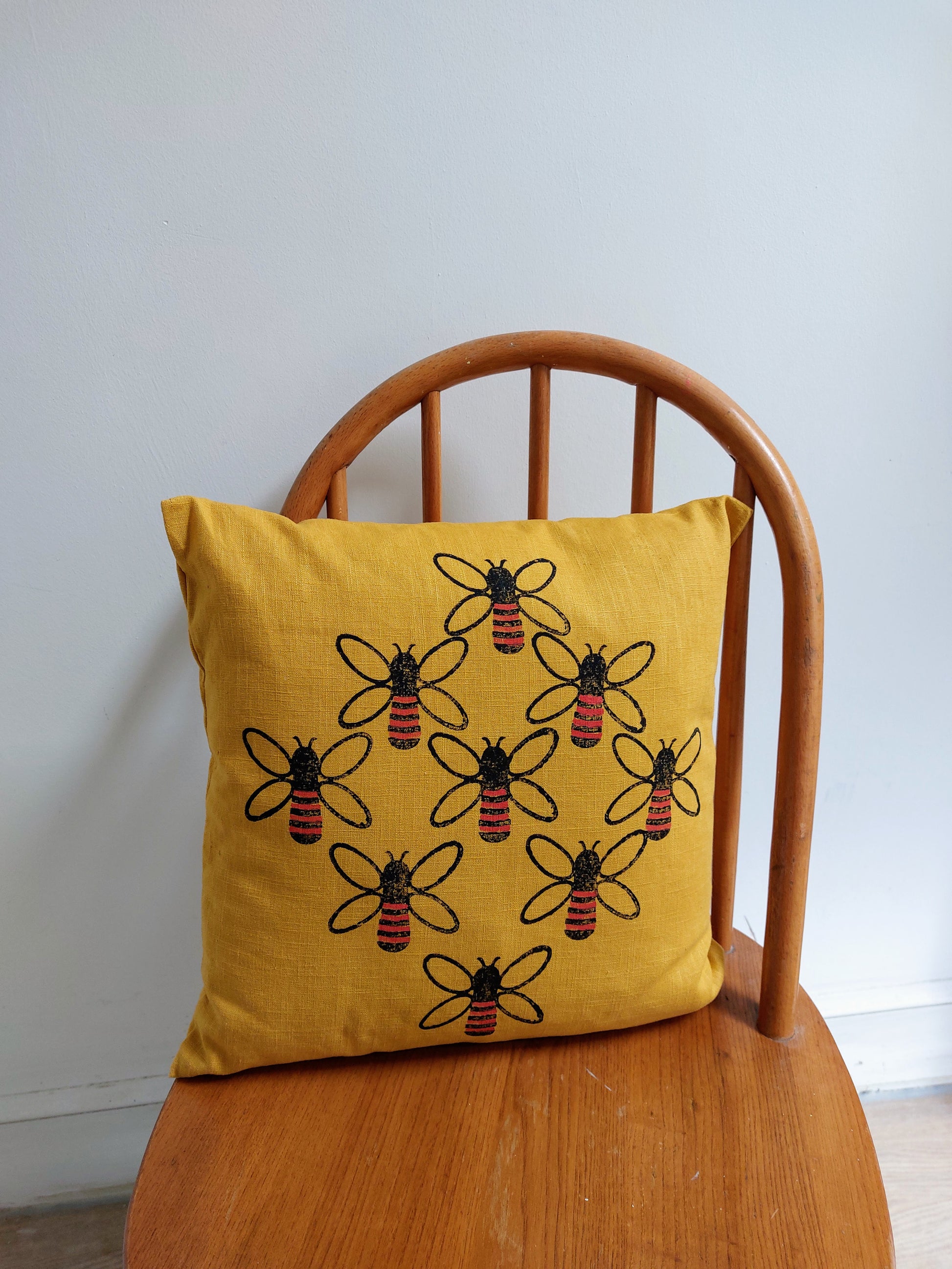 Buzzing bees on an mustard linen cushion. Finished with an envelope style closure.