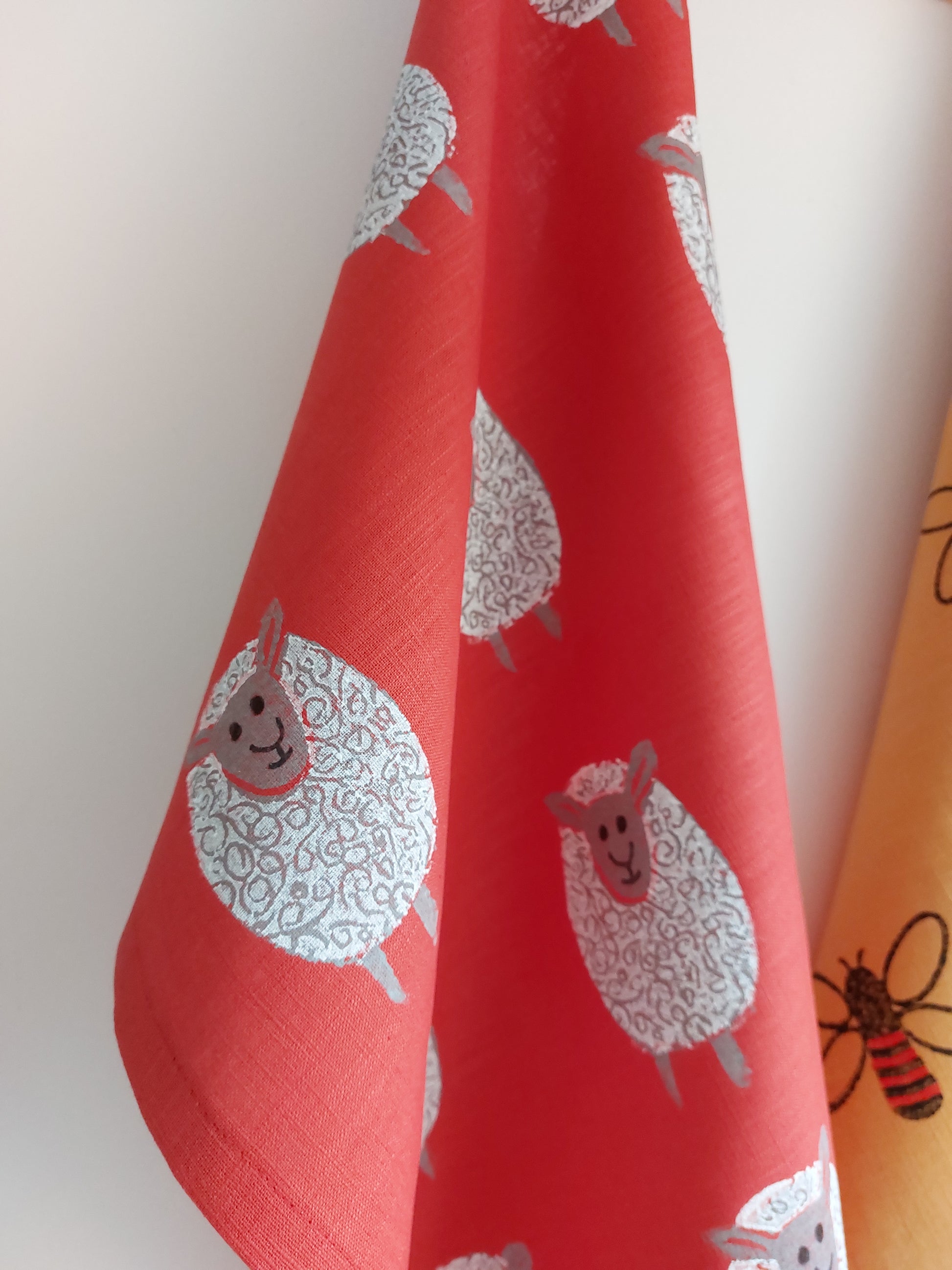 Linen tea towel hand printed with fluffy sheep on a marmalade background.