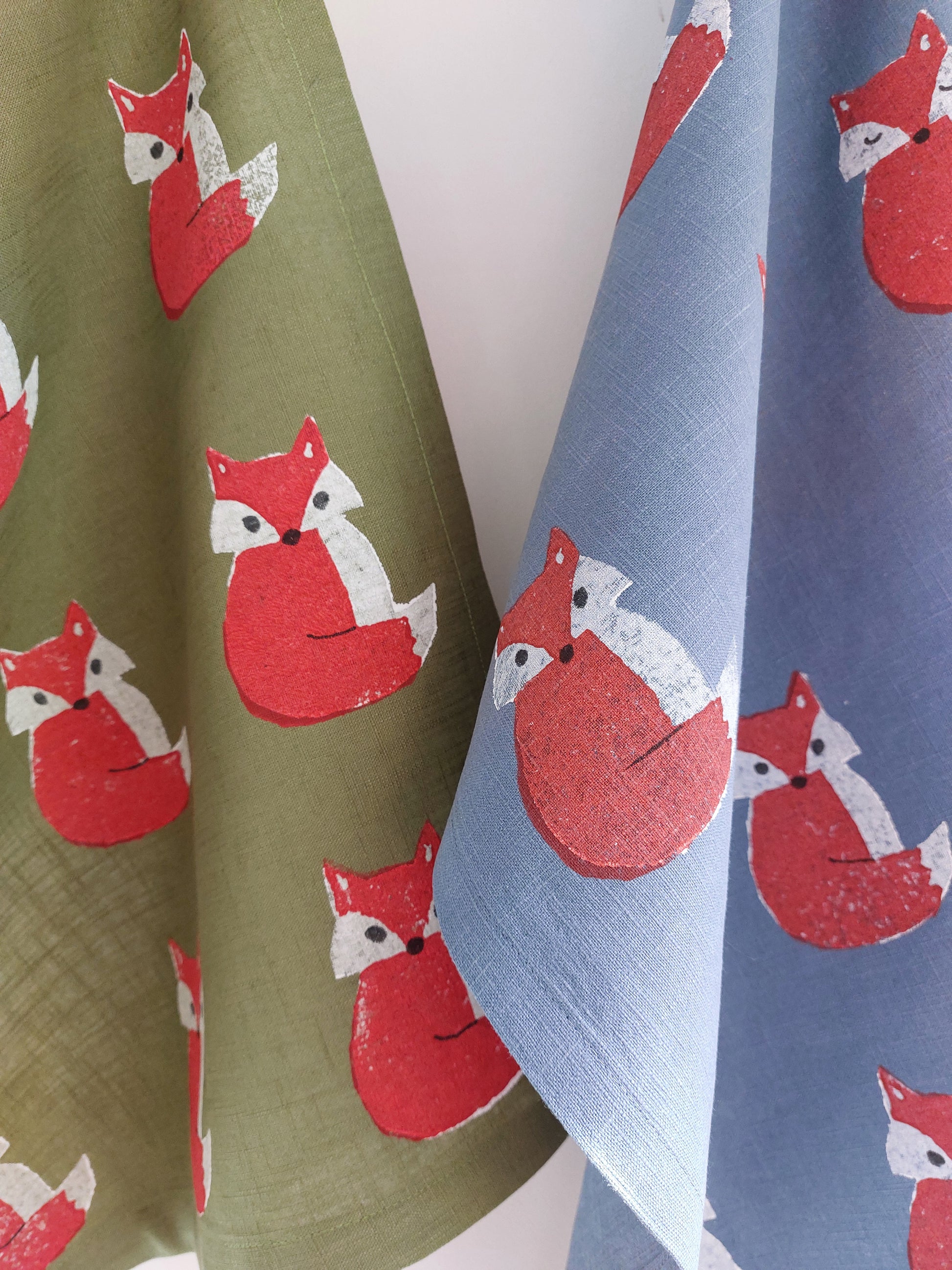 Linen tea towel hand printed with crafty foxes on mid blue.