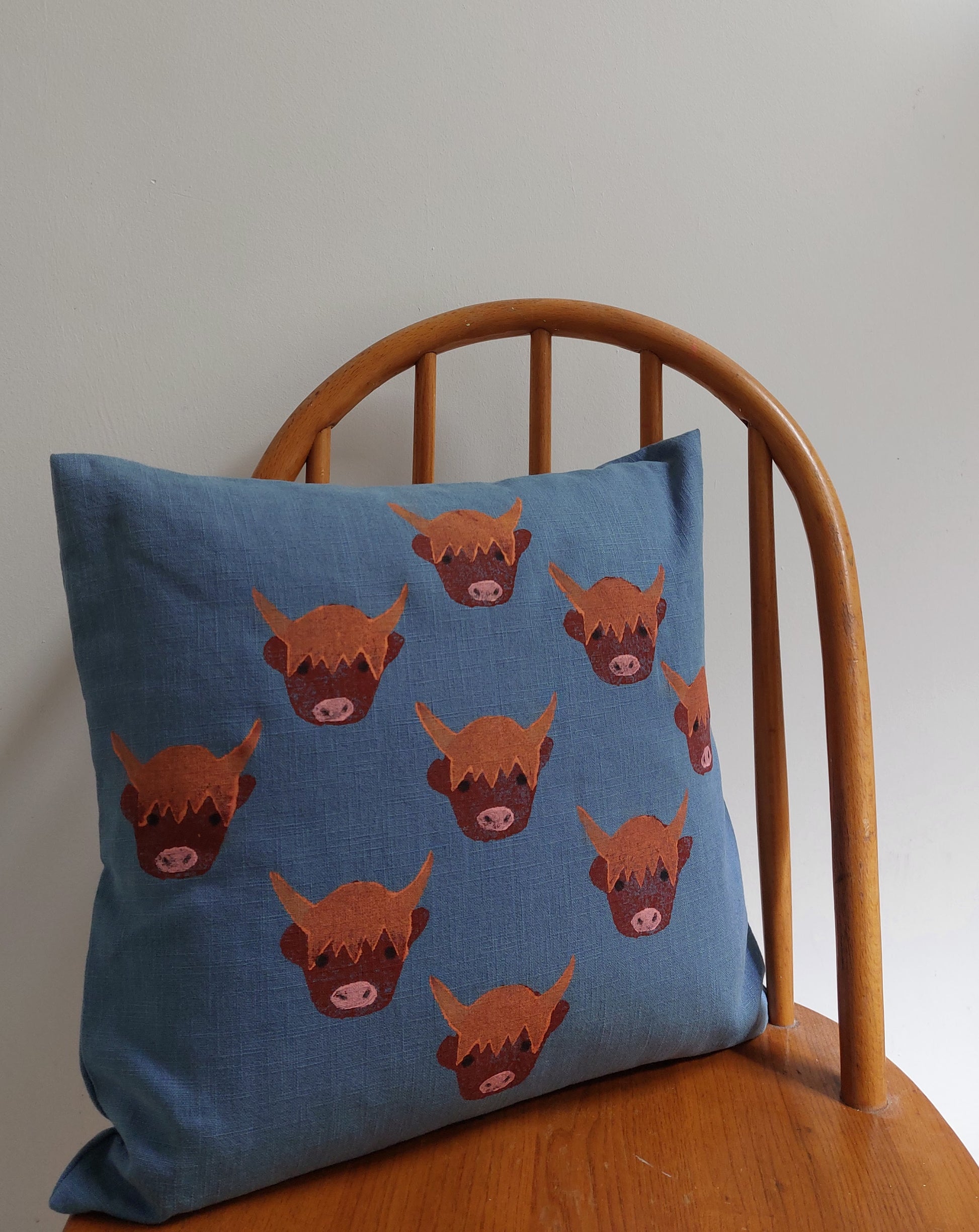Highland coos on a mid blue linen cushion. Finished with an envelope style closure.