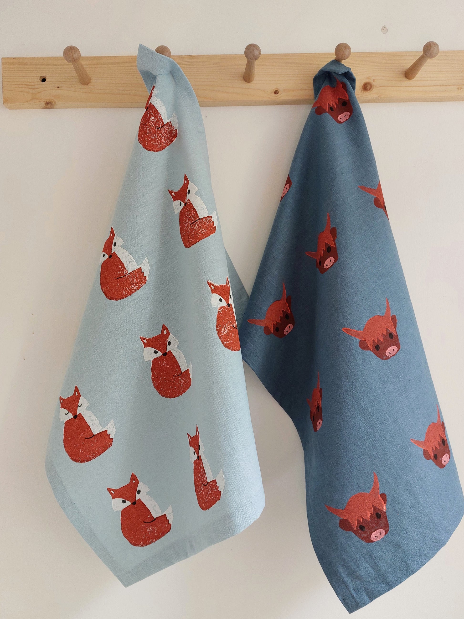 Linen tea towel hand printed with highland coos on mid blue background.